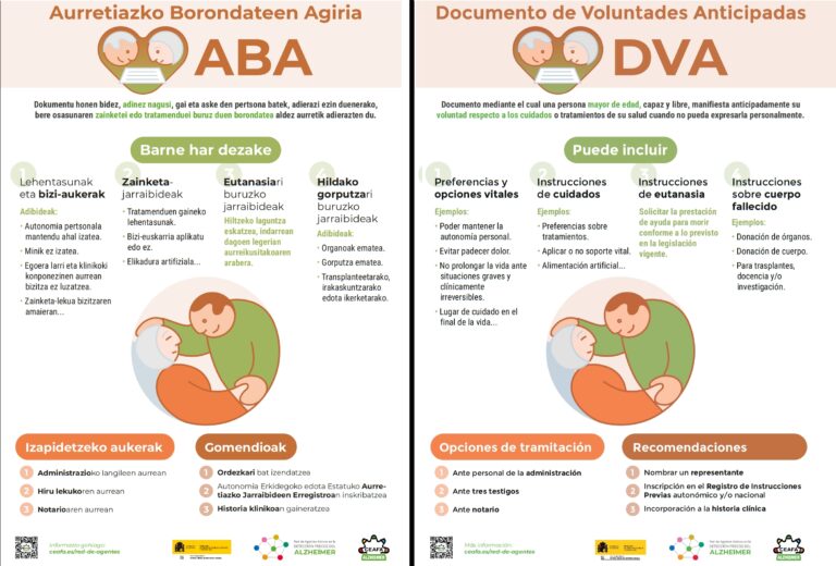 ZER DA ABD? Heriotza duina. Heriotza bizitzaren parte da. Familiarekin hitz egin. Orain erabakiko dut nola izan nahi dudan artatua, ezin izango dudanean. Nire bizitza amaitzea nola nahi dudan idatzita uzten dudan dokumentua, nire osasunaren kaltetze fisiko edo psikiko atzeraezinagatik, nire borondatea adierazi ezin dudan egoerara iristen banaiz. Zer jaso edo baztertu nahi dudan adierazten dut istripu, gaixotasun terminal edo sendaezin, zaintza mediko, tratamendu kirurgiko, esperimental, medikazio, lasaigarri eta abarretan. Laguntza erlijiosoa jaso nahi dudan edo ez. Nolako hileta nahi dudan, eta erraustua edo lurperatua izan nahi dudan. Azkar eta minik gabe hiltzeko borondatea adieraz dezaket, legeak eutanasia aktiboa edo positiboa onartzen badu, ekintza bidez (substantzia hilgarria emanda adibidez) Nire gorputza zientziari eman nahi diodan ikerketarako edo nire organoak transplanteetarako. Edozein unetan baliogabetu edo alda daiteke, erabakiak hartzeko gaitasuna gordetzen bada